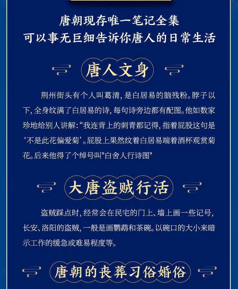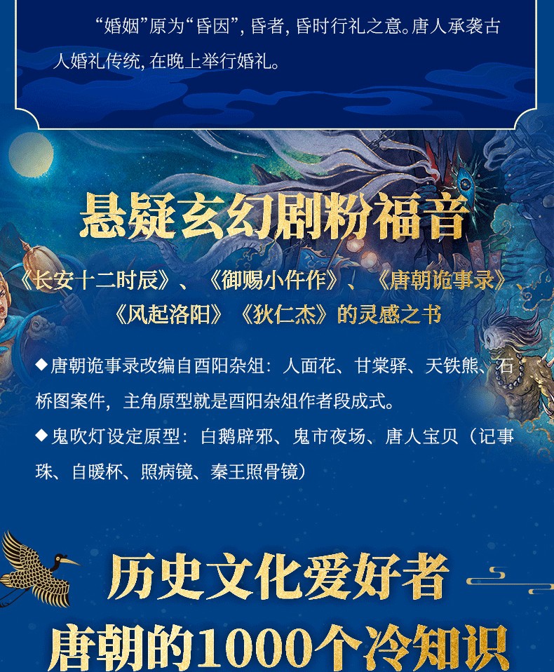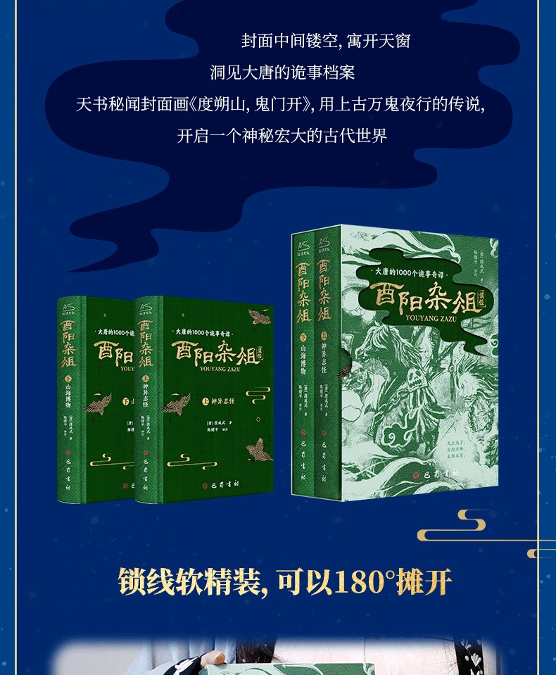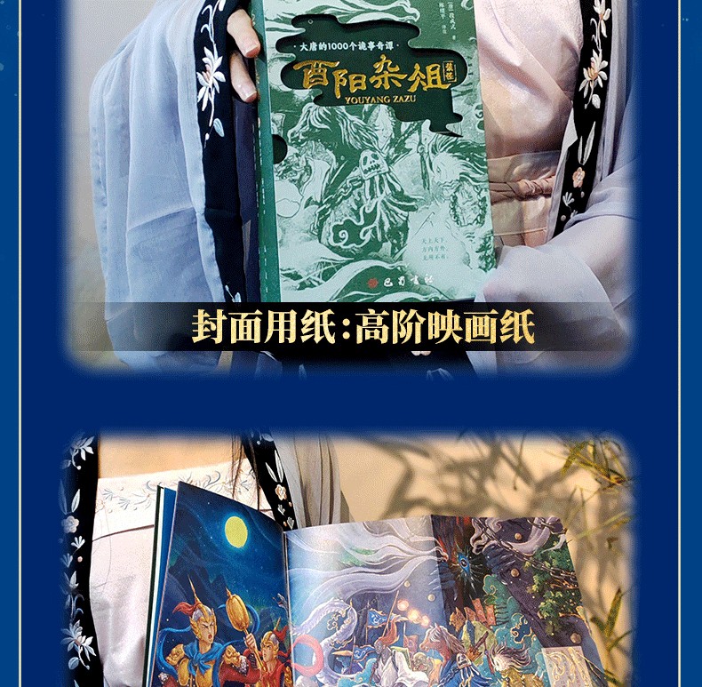 酉陽雜俎》唐代段成式創作的筆記小說集,共30卷,1000多個故事。分成上下兩部:上部神異志怪,上自女媧神話時代,下至唐朝時期,輯錄了600多個神話傳說、妖鬼奇譚與江湖故事;下部山海博物,近500個博物知識,從九代國王奇譚與江湖故事;下部山海博物,近500個博物知識,從九代部份到民間美食、刺青雜耍、醫術偏方…古老的生活無鉅細地講述唐事。