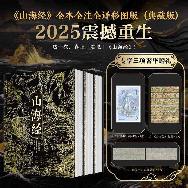 5.一套值得珍藏一輩子的《山海經》,不只書更是藝術品:滿版燙金封面設計,以高端藝術畫冊的標準打造顛覆傳統的《山海經》,一套三冊全部硬殼精裝,收藏有格調,禮贈顯品位!內頁使用仿古藝術紙,模擬古籍手感,閱讀儀式感max!隨書附贈11張《山系復原輿圖》+《華夏世系表》+32頁《神話思維導圖》,既是知識寶藏,也是藝術品級藏書!