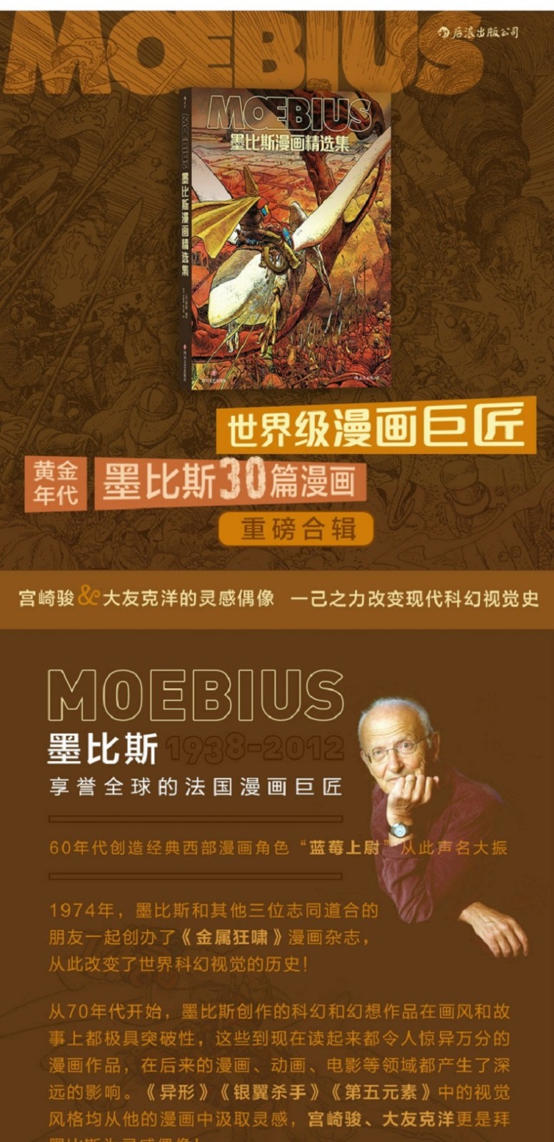 1990年代,美國漫威漫畫公司首*向本土大眾推廣法國漫畫家讓·吉羅以筆名「墨比斯」創作的全部作品。該系列涵蓋了墨比斯從20世紀70年代到90年代發表於《舵手》《金屬狂嘯》等漫畫雜誌上的經典中短篇作品,憑藉精彩絕倫的想像力和革命性的創作手法榮獲哈維獎“*佳外語作品獎”。