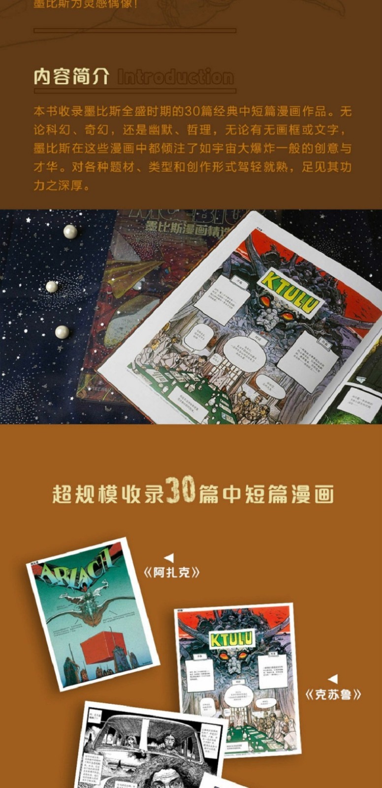中文版《墨比斯漫畫精選集》從中挑選出30部經典作品,依照創作時間和主題劃分為4個章節,並在每篇故事前標註作品首*發表時間,配以墨比斯自序,便於讀者了解其創作背景。其中te別收錄了讓·吉羅向墨比斯轉型的代表作《繞行》、令墨比斯一炮而紅的《阿扎克》(節選)、《封閉式車庫》的續篇《希庫裡號的來客》,以及墨比斯以漫畫形式創作的關於自己的專訪,可謂一本不容錯過的墨比斯集大作。