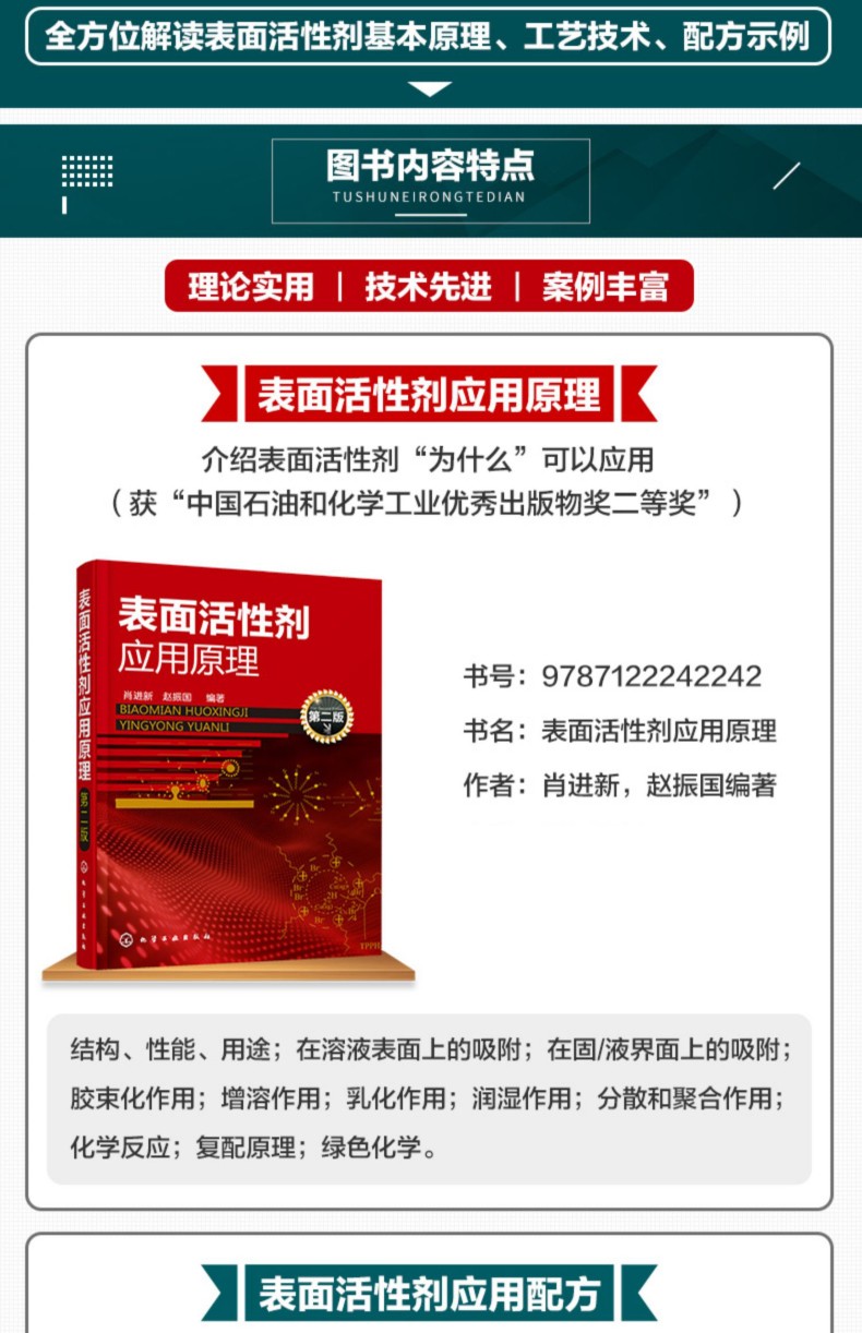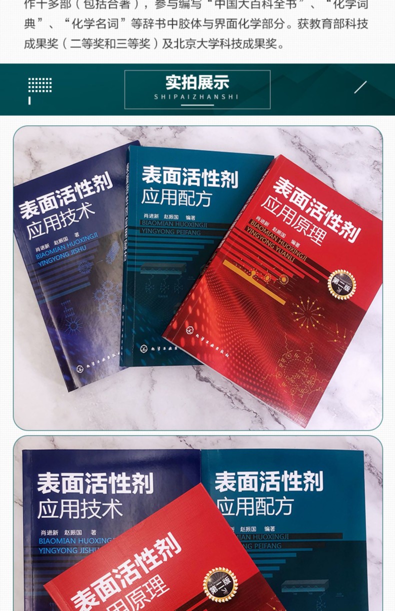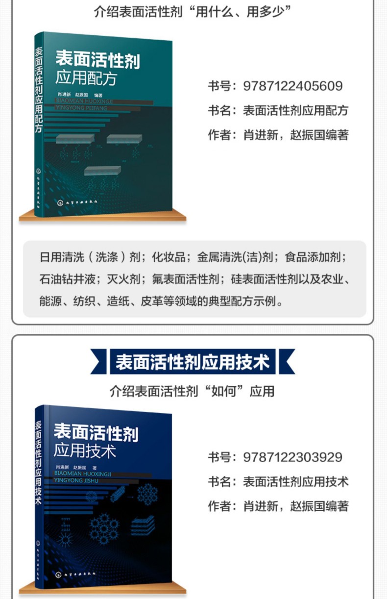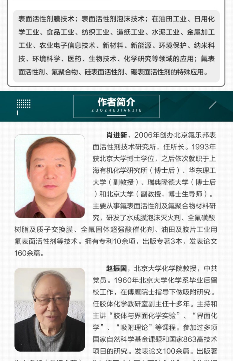2.《表面活性劑應用原理》兩位作者分別為北京氟樂邦表面活性劑技術研究所所長和北京大學化學與分子工程學院教授,皆為表面活性劑行業專家;