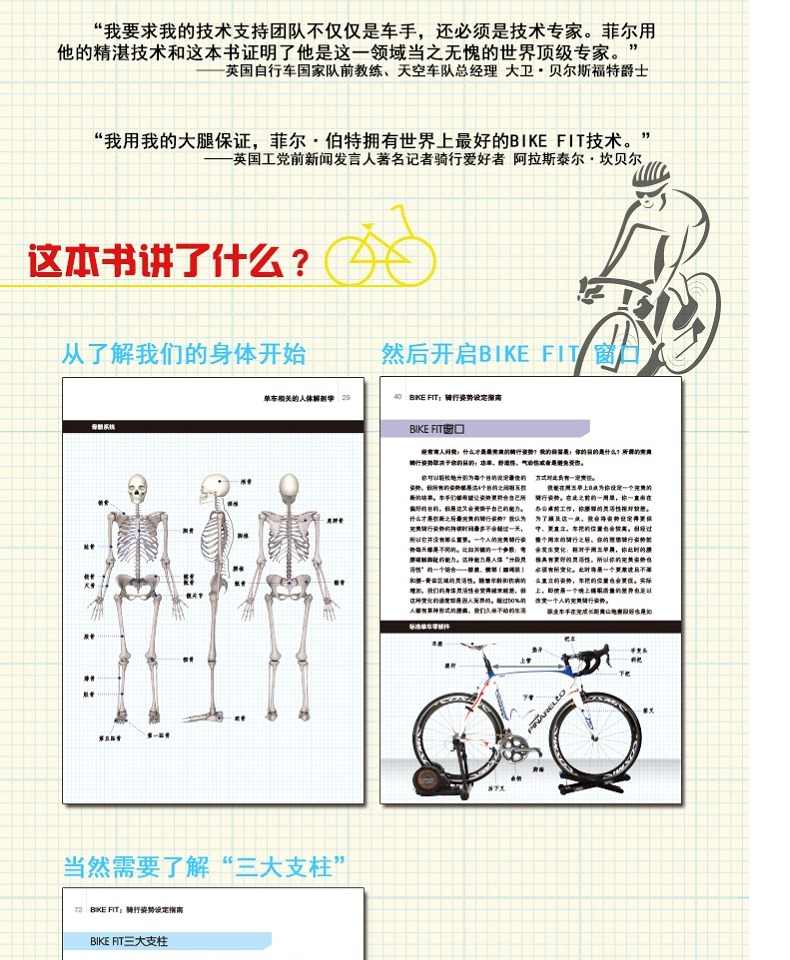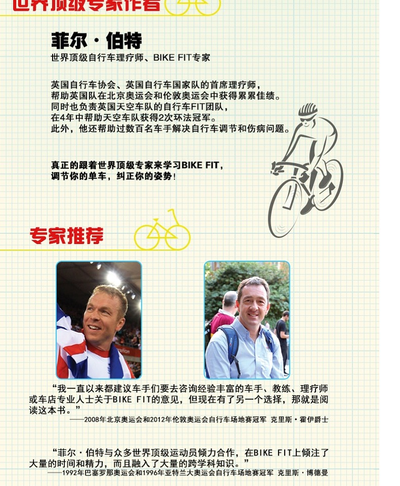 專業,作者為英國自行車國家隊的首席理療師、環法冠軍車隊英國天空車隊的自行車調節團隊負責人。他的水平是自行車醫學的專業水平,而且具有豐富的實踐經驗,因此書中內容具有很強的科學性,對於自行車運動有很好的指導作用。