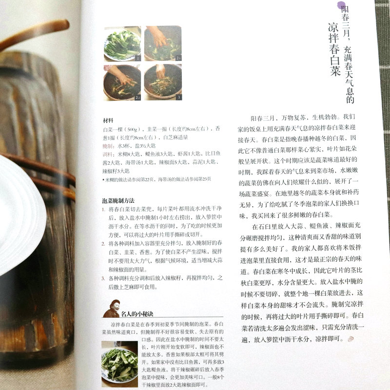 第1部分,姜順義老師通過圖文介紹,講述了適合春夏秋冬各個季節食用的泡菜做法和背後的故事,像適合春天食用的涼拌春白菜、涼拌春白菜蘿蔔泡菜、蘿蔔方塊水泡菜、石上菜泡菜,適合夏天食用的黃瓜夾餡水泡菜、洋蔥泡菜、圓白菜白泡菜等等,適合冬秋天的沙參泡菜、蓮藕泡菜等等,適合冬天食用的辣椒籽白菜泡菜、正蘿蔔泡菜等等。