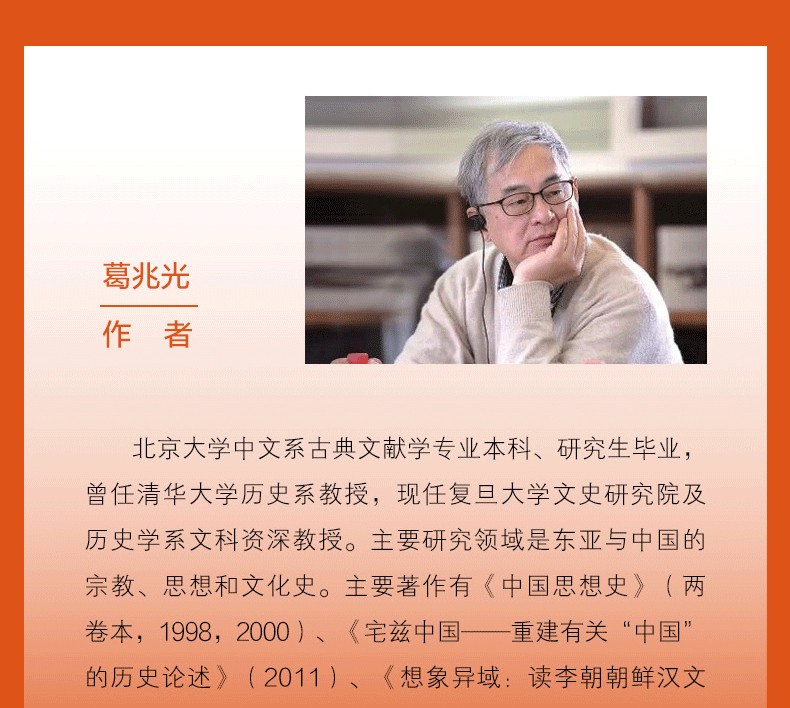 葛兆光,北京大學中文系古典文獻專業本科、研究生畢業,曾任清華大學歷史系教授,現任復旦大學文史研究院及歷史學系文科資深教授。主要研究領域是東亞與中國的宗教、思想和文化史。主要著作有《中國思想史》(兩卷本,1998,2000)、《宅茲中國——重建有關“中國”的歷史論述》(2011)、《想像異域:讀李朝朝鮮漢文燕行文獻札記》(2014)等。