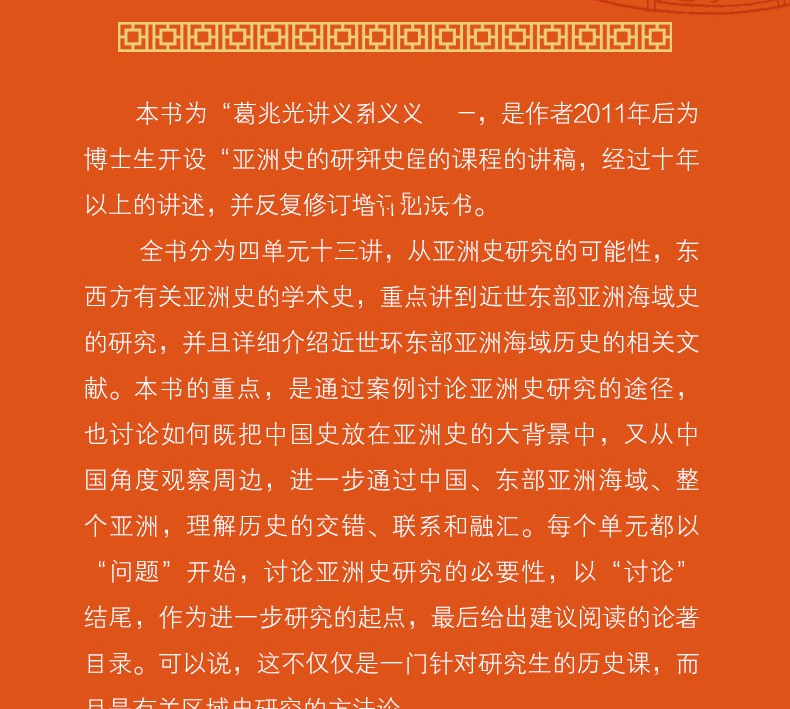 本書為“葛兆光講義系列”之一,是作者2011年後為博士生開設“亞洲史的研究方法”課程的講稿,經過十年以上的講述,並反復修訂增補後成書。全書分為四單元十三講,從亞洲史研究的可能性,東西方有關亞洲史的學術史,重點講到近世東部亞洲海域史的研究,並且詳細介紹近世環東部亞洲海域歷史的相關文獻。本書的重點,是通過案例討論亞洲史研究的途徑,也討論如何既把中國史放在亞洲史的大背景中,又從中國角度觀察周邊,進一步通過中國、東部亞洲海域、整個亞洲,理解歷史的交錯、聯繫和融匯。每個單元都以“問題”開始,討論亞洲史研究的必要性,以“討論”結尾,作為進一步研究的起點,最後給出建議閱讀的論著目錄。可以說,這不僅僅是一門針對研究生的歷史課,而且是有關區域史研究的方法論。