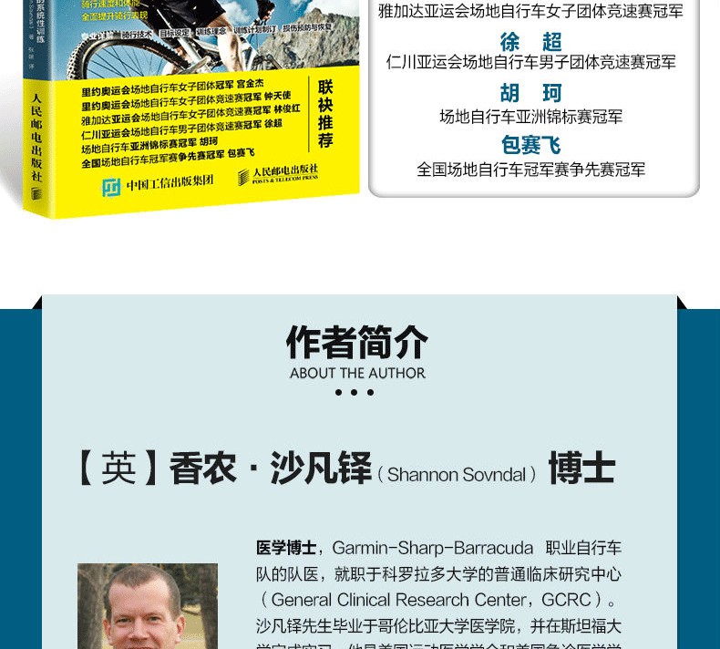 [英]香農·沙凡鐸(Shannon Sovndal) 博士 醫學博士,也是Garmin-Sharp-Barracuda 職業自行車隊的隊醫,任職於科羅拉多大學的普通臨床研究中心(General Clinical Research Center,GCRC)。沙凡鐸先生畢業於哥倫比亞大學醫學院,並在斯坦福大學完成實習。他是美國運動醫學學會和美國急診醫學學會成員。成為醫生之前,他曾是一名職業公路自行車賽車手,贏得了加利福尼亞自行車錦標賽冠 軍,以及無數其他公路賽和環形公路賽冠 軍頭銜。沙凡鐸先生已發表了數篇有關自行車運動的文章,在急救醫學方面同樣著作頗豐。