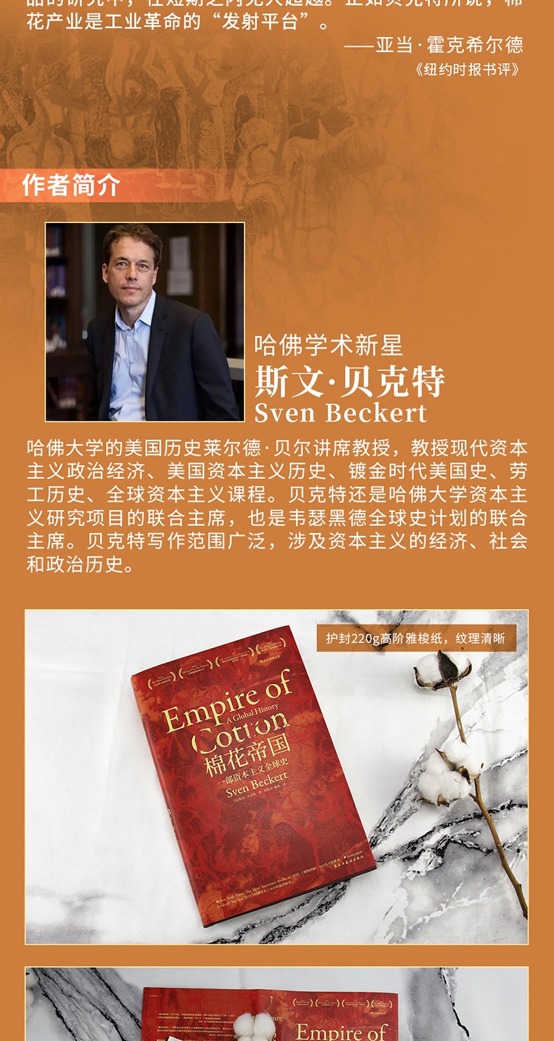 本書是名副其實的全球史,內容涉及五大洲,將非洲的販奴貿易和紅海貿易聯繫在了一起,將美國南北戰爭和印度棉花種植聯繫在了一起。在貝克特波瀾壯闊的巨著中,商人、商業資本家、經紀人、代理人、國家官僚、工業資本家、佃農、自耕農、奴隸都有自己的角色,貝克特清楚地表明,這些人的命運是如何與近代資本主義發展聯繫在一起的,又是如何塑造我們現在這個存在著巨大不平等的世界的。本書告訴我們,並不存在一個所謂的“全球化”資本主義階段,資本主義從一開始就是全球化的。