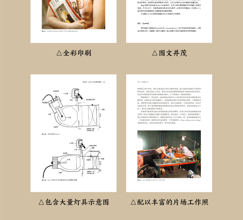 258幅精選燈位圖、工具示意圖、操作示意圖、照明效果圖、片場工作照、器材實物圖,實用的光度數據、燈具規格、電工表格,為片場操作提供直觀參考。