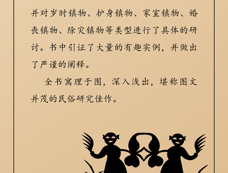 本書對鎮物的起源、性質、特徵、體系、功能、演進與價值等,作了系統的介紹,並對歲時鎮物、護身鎮物、家室鎮物、婚喪鎮物、除災鎮物等類型進行了具體的研討。書中引證了大量的有趣實例,並做出了嚴謹的闡釋。