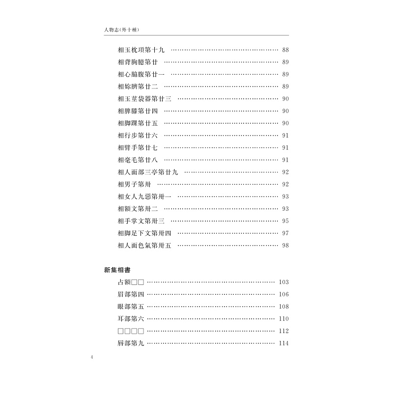 本書收錄《古觀人法》《神相全編》《相法十六篇》《鑑辨小言》《神相鐵關刀》《白鶴仙數相法》等作品。其中《神相全編》卷帙宏富,廣採諸家,內容詳備,堪當中國古典相人術集大成之作品。此書明清時流傳較廣,《麻衣相法》《統會諸家相法》等皆據其剪裁而成。 《古觀人法》與《鑑辨小言》短小精悍、眉目清朗,為文人相法之代表作品。其中《鑑辨小言》又名《冰鑑》,在近現代頗具影響力。 《相法十六篇》《神相鐵關刀》《白鶴仙數相法》三書文辭簡易,實操性強,為術士相法之代表作品。本書蒐集諸多版本,對所選作品進行了精心點校,供相法研究者和愛好者參考。