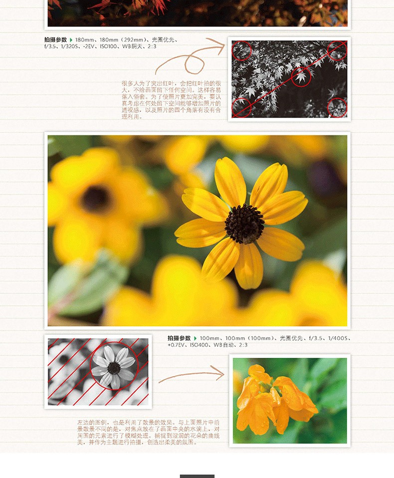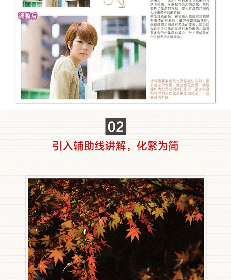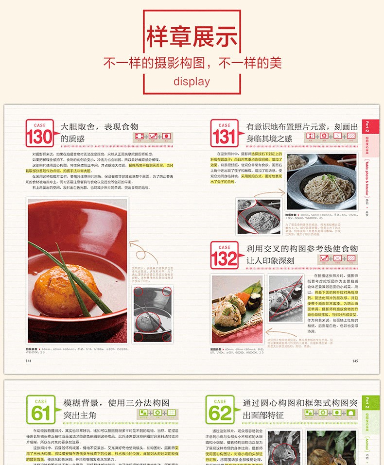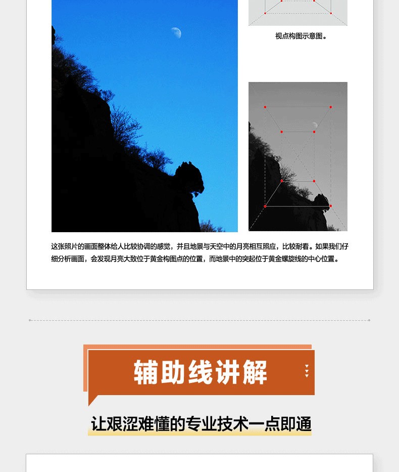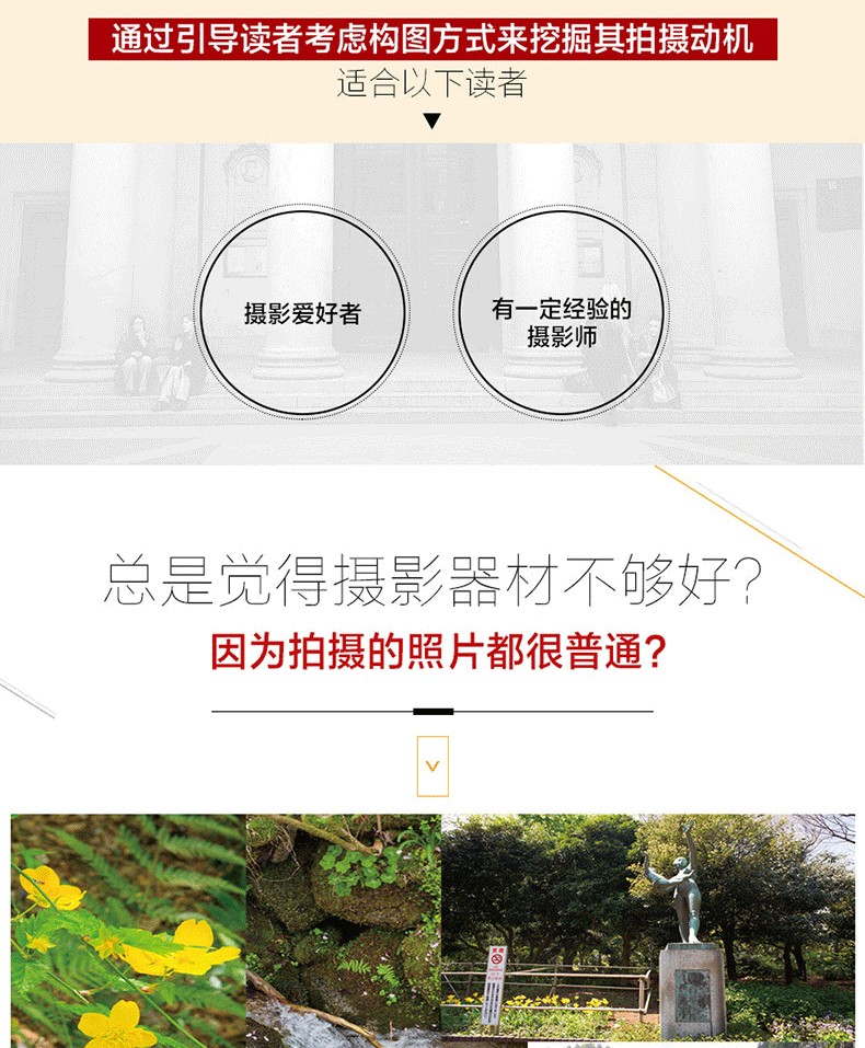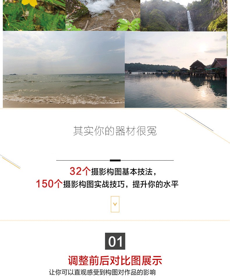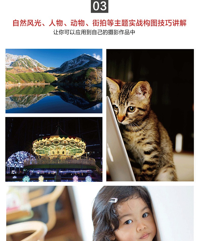 調整前後對比圖展示,讓你可以直觀感受到知名構圖對作品的巨大影響; 引入輔助線講解,化繁為簡,讓晦澀的攝影術語也能一看就懂; 自然風光、人物、動物、街拍等主題實戰構圖技巧講解,讓你可以真正應用到自己的攝影作品中。