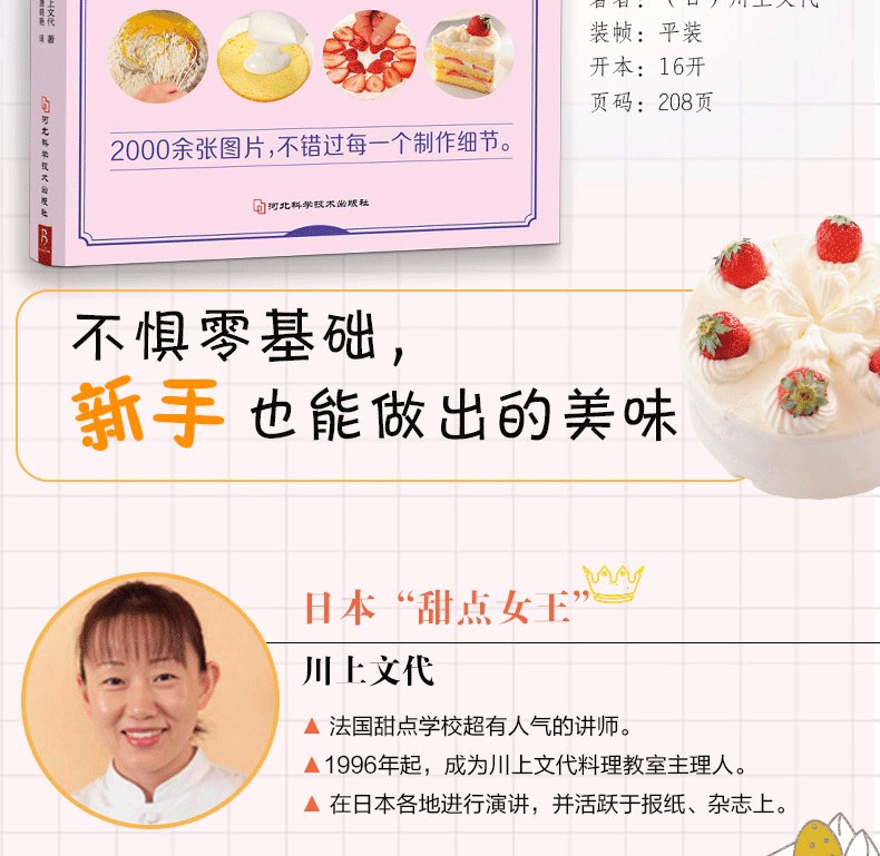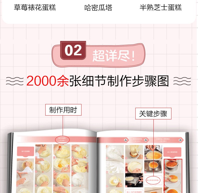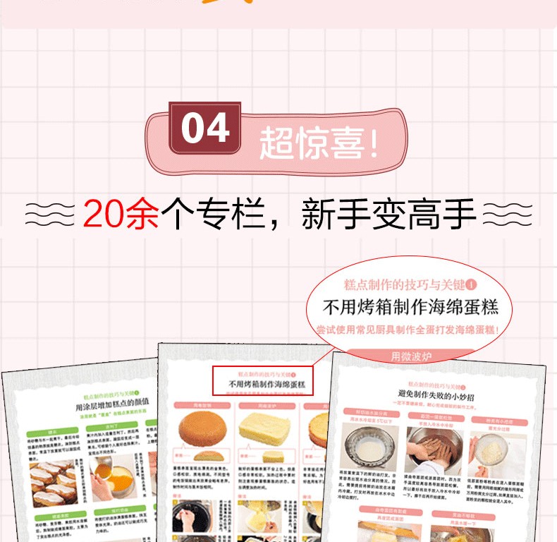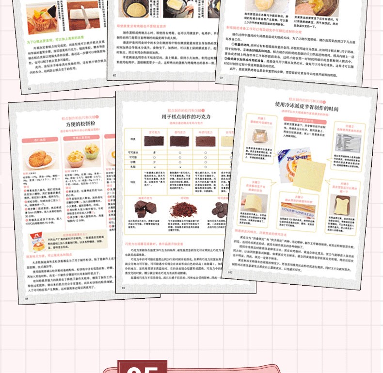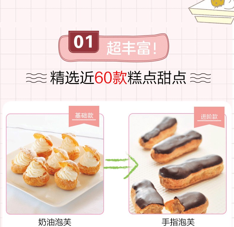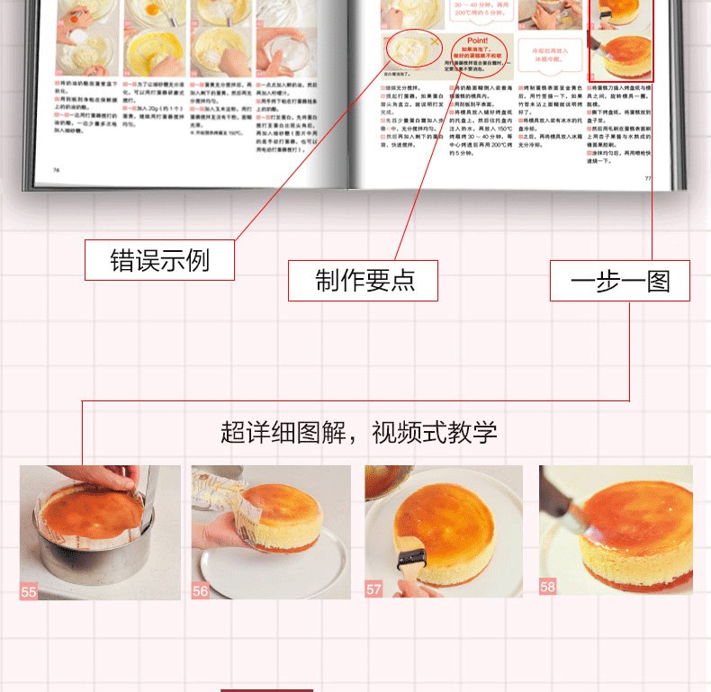 2000餘張圖片。每款糕點都搭配了幾十張步驟圖和詳細解說。可一邊觀察實際狀態,一邊對照圖片,確保萬無一失。 22篇製作技巧總結,將這些竅門一一掌握便可不斷提升製作技藝。從基礎款糕點到改良款糕點,滿足初學者和想進一步提高烘焙技藝人士。