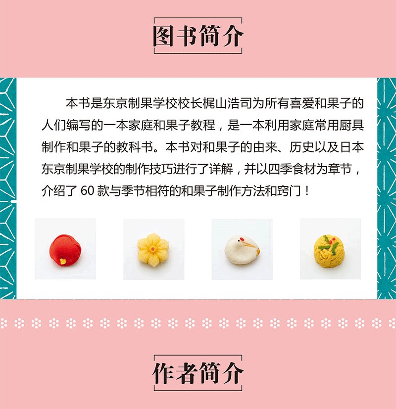 《詳盡的日式點心教科書》是東京製果學校校長梶山浩司為所有喜愛和果子的人們編寫的一本家庭和果子教程,是一本利用家庭常用廚具製作正宗和果子的教科書。 《詳盡的日式點心教科書》對和果子的由來、歷史以及日本東京製果學校獨特的製作技巧進行了詳解,並以四季食材為章節,介紹了60款與季節相符的和果子製作方法和竅門!