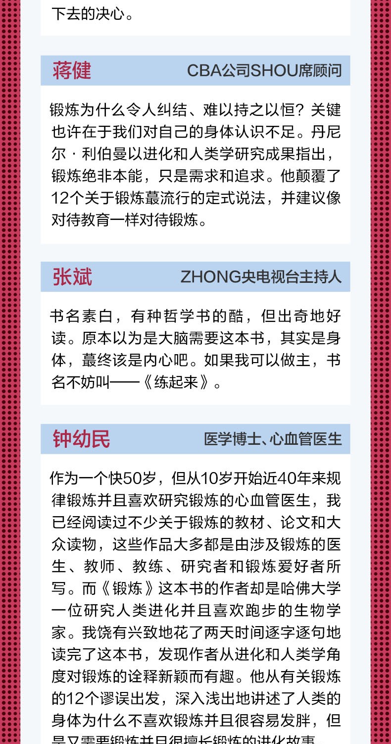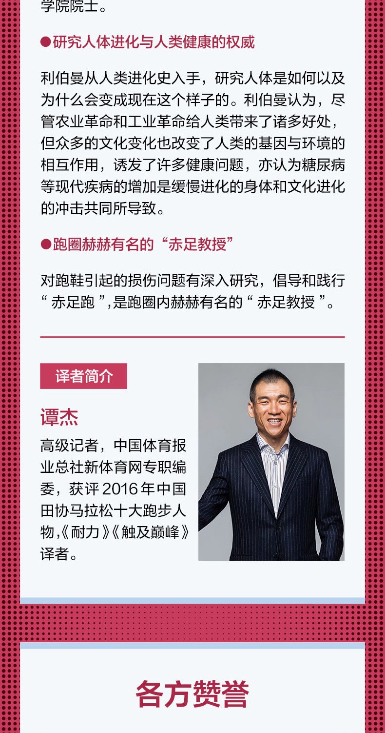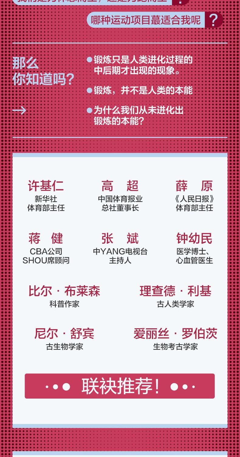 中國體育報業總社GAO級記者譚傑傾情翻譯。新華社體育部主任許基仁,中國體育報業總社董事長高超,CBA公司首XI顧問蔣健,《人民日報》體育部主任薛原,中YANG電視台主持人張斌,醫學博士、心血管醫生鐘幼民,科普作家比爾·布萊森,古人類學家理查德·利基,古生物學家尼爾·舒賓,生物考古學家愛麗絲·羅伯茨等聯袂推薦。