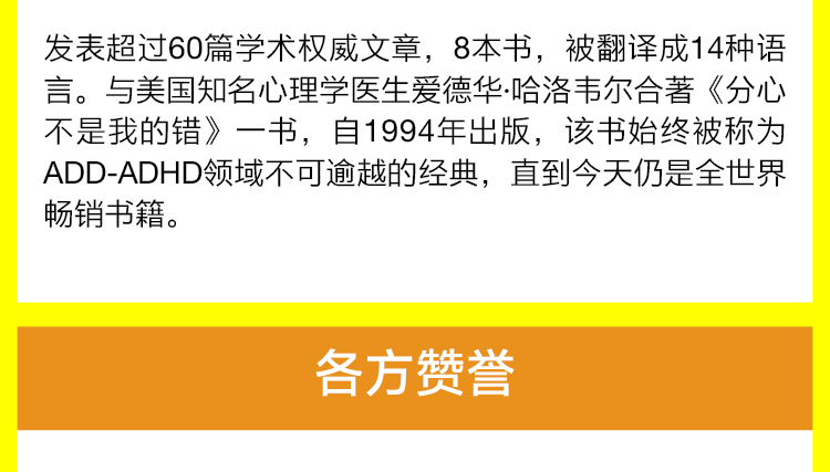 發表超過60篇學術權威文章,8本書,被翻譯成14種語言。與美國知名心理學醫生愛德華·哈洛韋爾合著《分心不是我的錯》一書,自1994年出版,該書始終被稱為ADD-ADHD領域不可逾越的經典,直到今天仍是暢銷書籍。