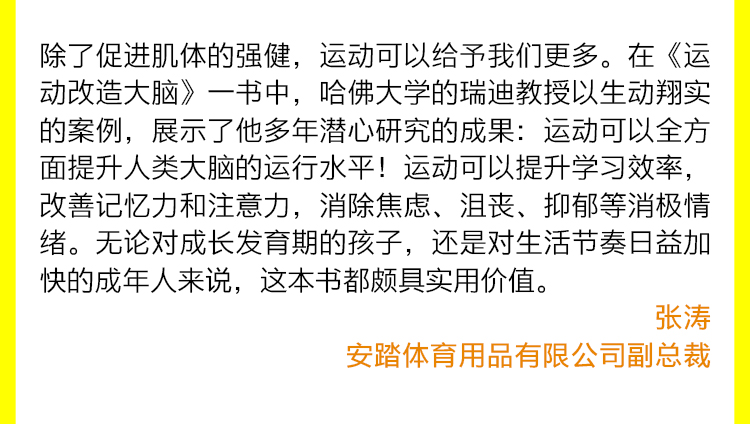 風靡Q球的暢銷讀物。網站書榜、引爆《紐約時報》暢銷榜單,重印C過16次、被譯為10種語言風靡Q球的革命性讀物,19000名中學生驗證的運動奇蹟,Q球12個國家和地區正在流行,令120000人受益的生活新方式