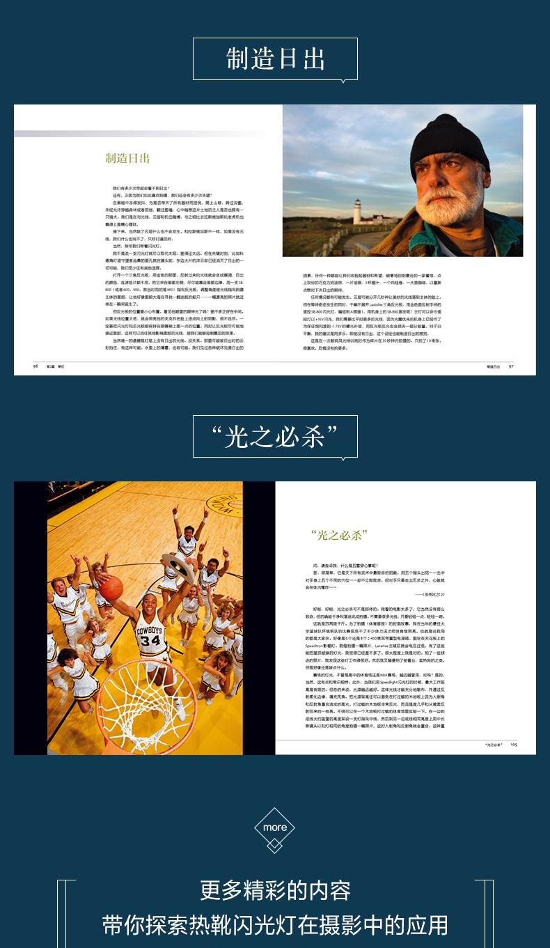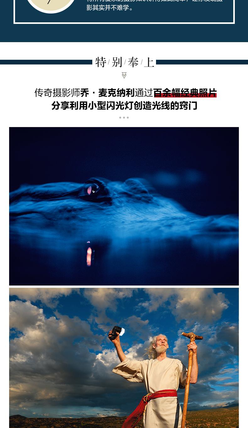 本書是美國有名攝影師喬·麥克納利繼經典暢銷書《瞬間的背後》之後推出的又一部力作。與前作全方位地綜合介紹各種攝影技巧和概念不同,作者在本書中著重帶領讀者探索熱靴閃光燈在攝影中的應用。以開篇系統介紹各種器材、附件為基礎,他將從最簡單的單燈應用出發,逐步擴展到雙燈、多燈應用,以他親身拍攝的雜誌或商業圖片為實例,深入淺出地向讀者展現閃光燈攝影的多彩世界。無論您具備多少攝影經驗,您都能從本書中學到以前難以想像的攝影技巧,並在實戰中領略到一名職業攝影師既有趣又迷人的一面。