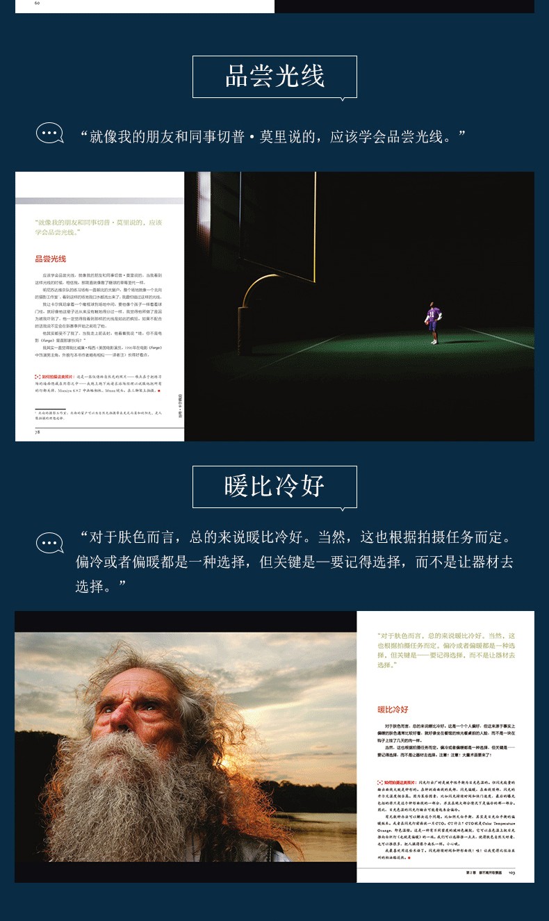 一句精闢的語錄,一張讓人醍醐灌頂的照片,然後再聊聊照片背後的故事,它的來龍去脈,拍攝趣聞,以及怎樣才能拍出這類照片。在本書中您不但能夠欣賞到這位攝影大師的傑作,還能學到他那些真金白銀的絕技。同時,和相機打了一輩子交道的作者還與讀者分享了他那些激動人心而又驚心動魄、令人沮喪又無比動人的故事。