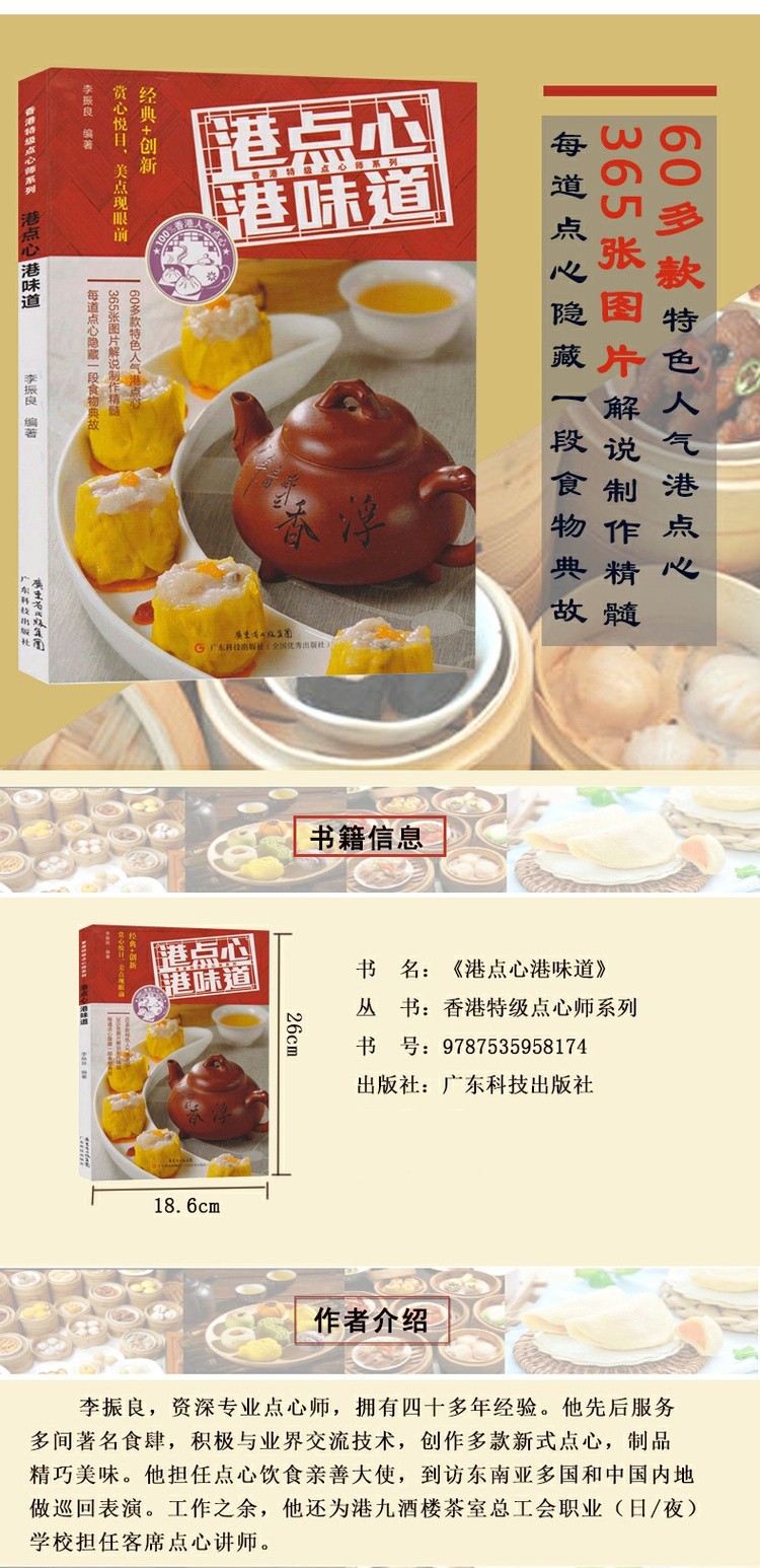 本書是從香港萬裡引進“港味道”系列中的一本點心製作教程,由香港資歷專業點心師李振良編著,主要面對點心師傅以及有基礎的點心製作者。本書精挑59款香港人氣點心,所選點心既有經典又有新意。全書150張圖片分佈詳解製作過程,“名師點撥”欄目點出每道點心製作的精髓。除此之外每道點心都包含一段食物掌故,使這本書既實用又有點歷史意味。本書分為“包類”“餃子、燒賣類”“糕類”“炸類”“焗類”“凍糕、軟皮點心類”“腸粉、小食類”“湯水類”8個部分,每道點心除列明“材料”、圖文兼備細說“做法”外,還包含“製作時間”“份量”“名師點撥”“掌故”等內容,版式新潮,圖片精美,賞心悅目。