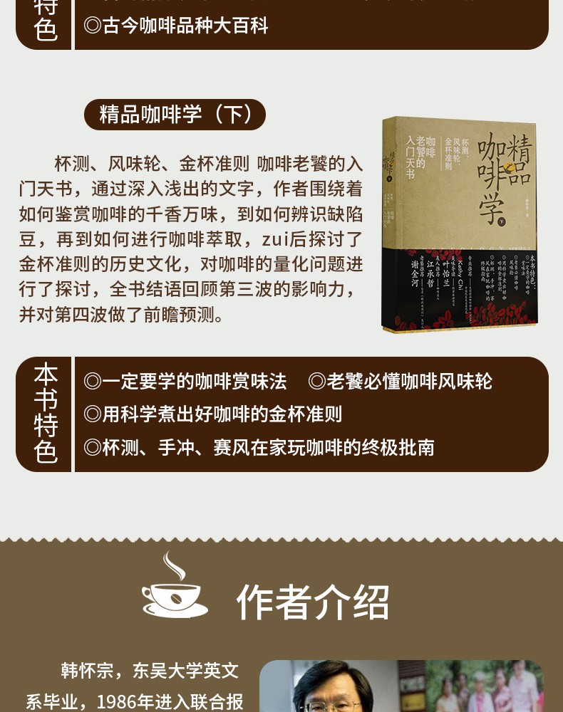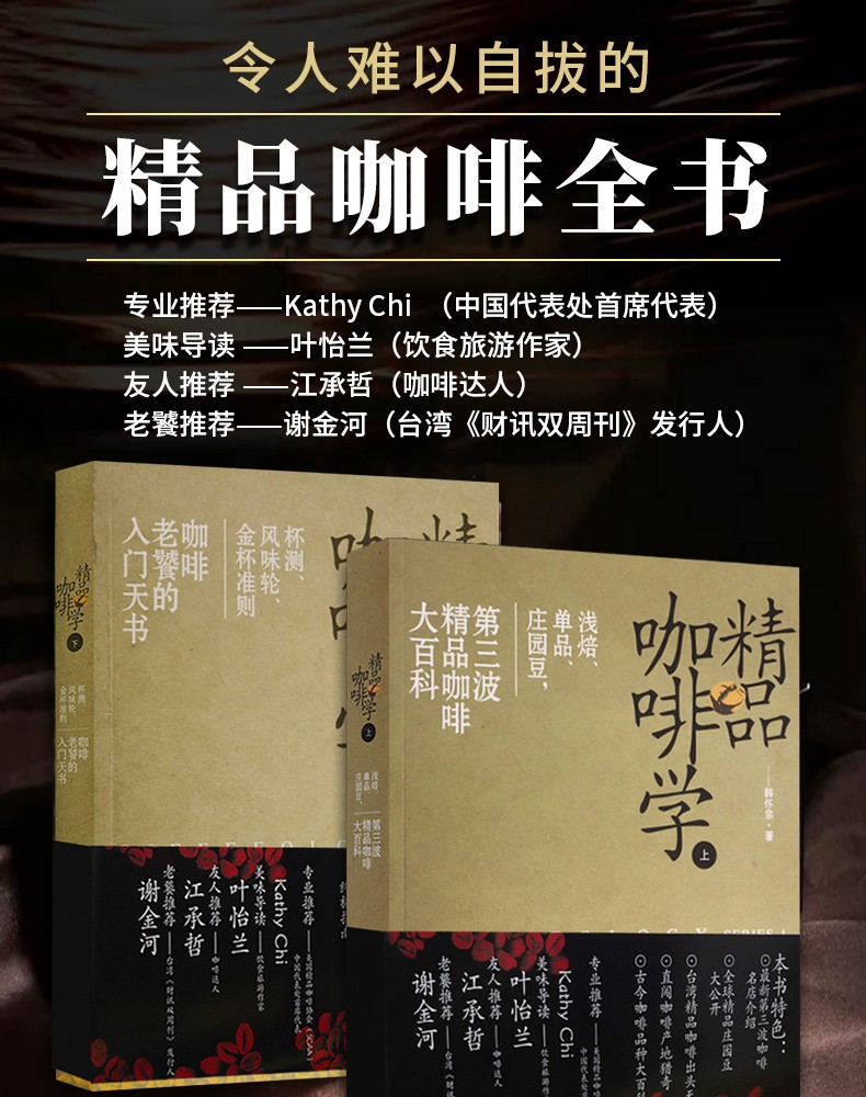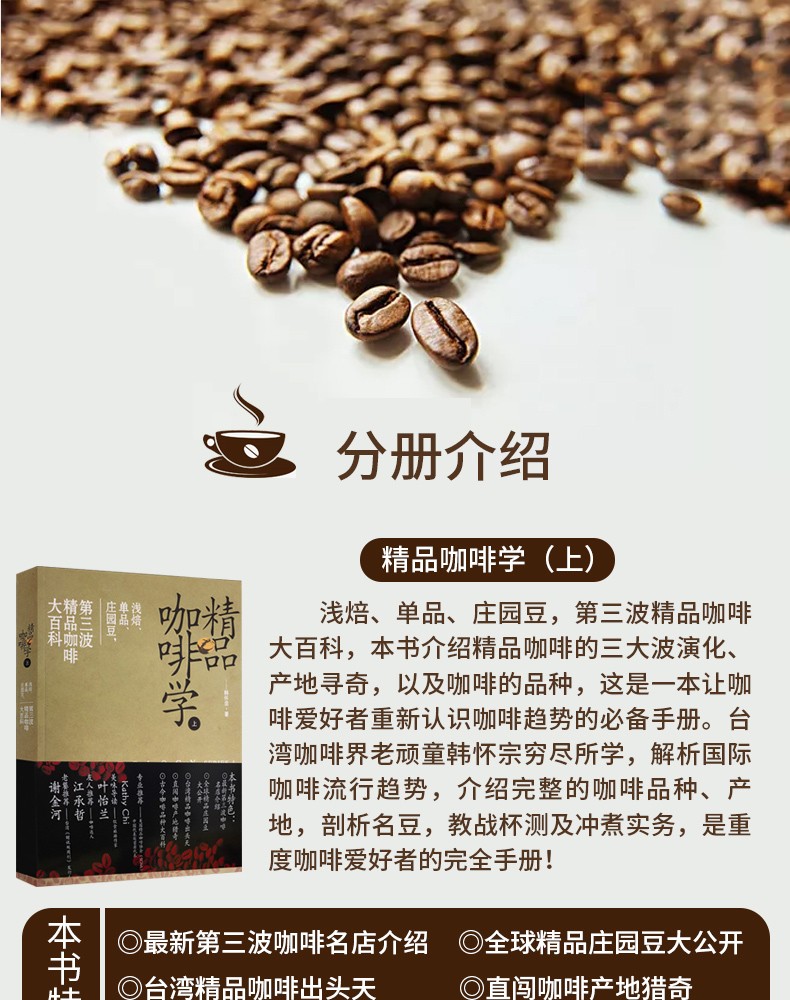 《精品咖啡學(上):淺焙、單品、莊園豆,第三波精品咖啡大百科》介紹精品咖啡的三大波演化、產地尋奇,以及咖啡的品種,這是一本讓咖啡愛好者重新認識咖啡趨勢的手冊。台灣咖啡界老頑童韓懷宗窮盡所學,解析國際咖啡流行趨勢,介紹完整的咖啡品種、產地,剖析名豆,教戰杯測及沖煮實務,是重度咖啡愛好者的完全手冊!