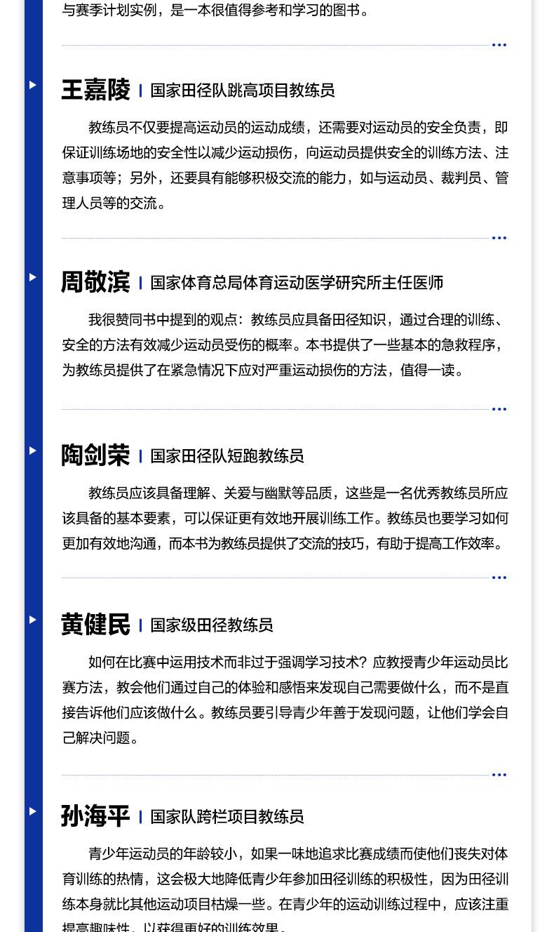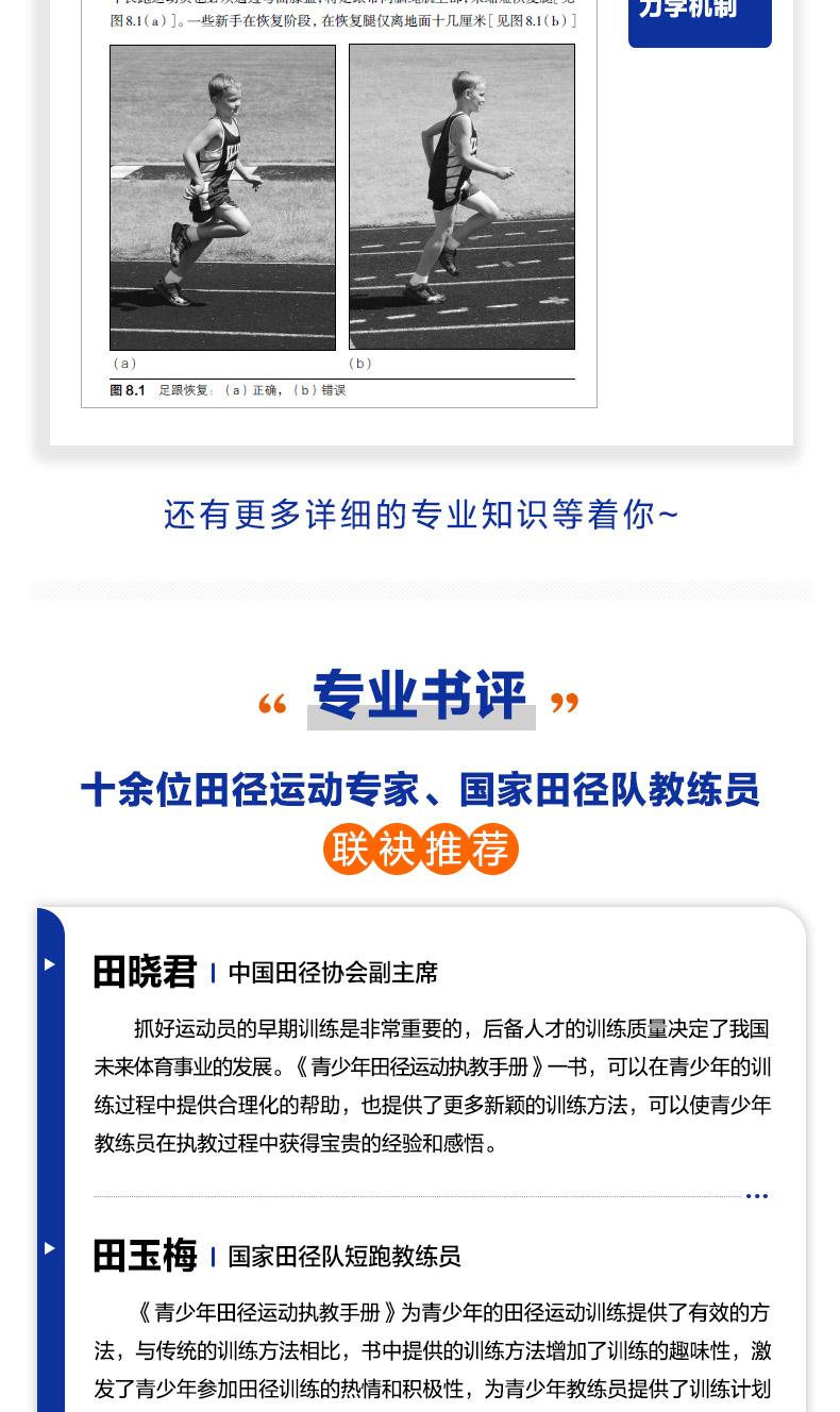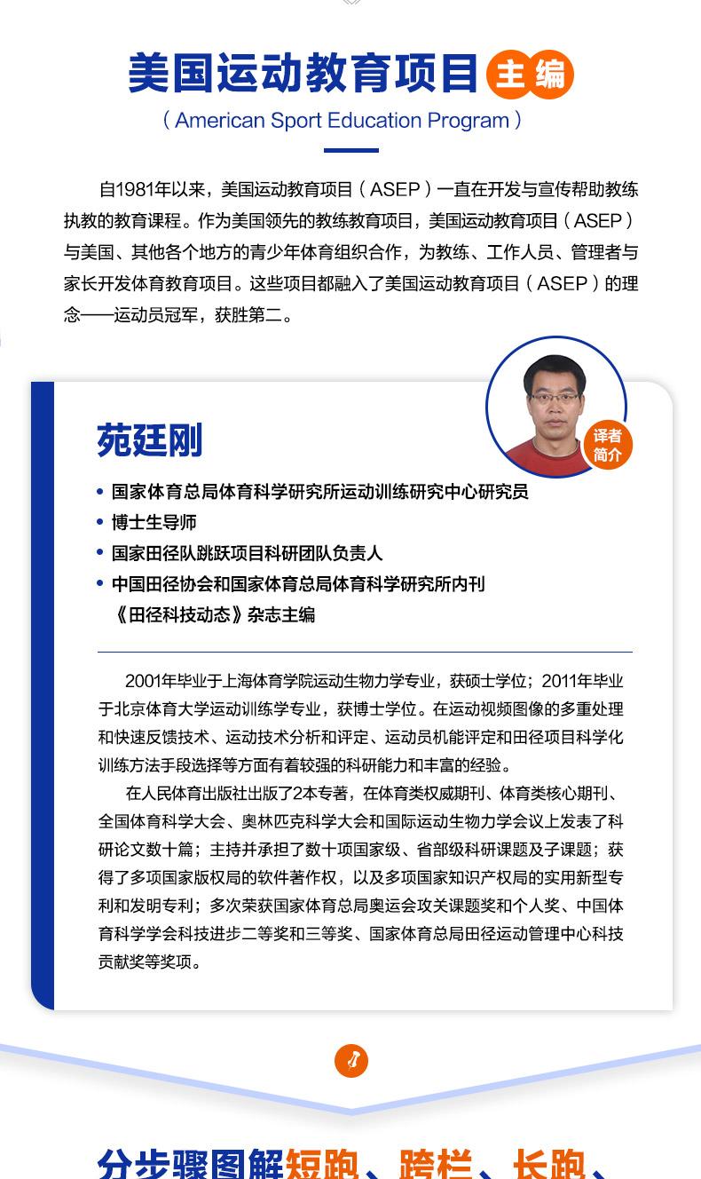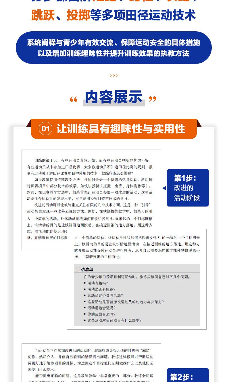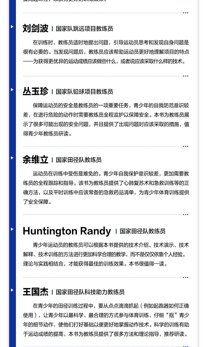 美國田徑協會官方推薦 中小學體育教師、少兒體適能俱樂部教練以及想在中考體育中取得優異成績的學生及家長、中小學田徑隊運動員工具書 分步驟圖解短跑、跨欄、長跑、跳躍、投擲等多項田徑運動技術 系統闡釋與青少年有效交流、保障運動安全的具體措施 以及增加訓練趣味性並提升訓練效果的執教方法 中國田徑協會副主 席田曉君、國家田徑隊教練員、北京體育大學田徑學院教師等十餘位專家聯袂推薦