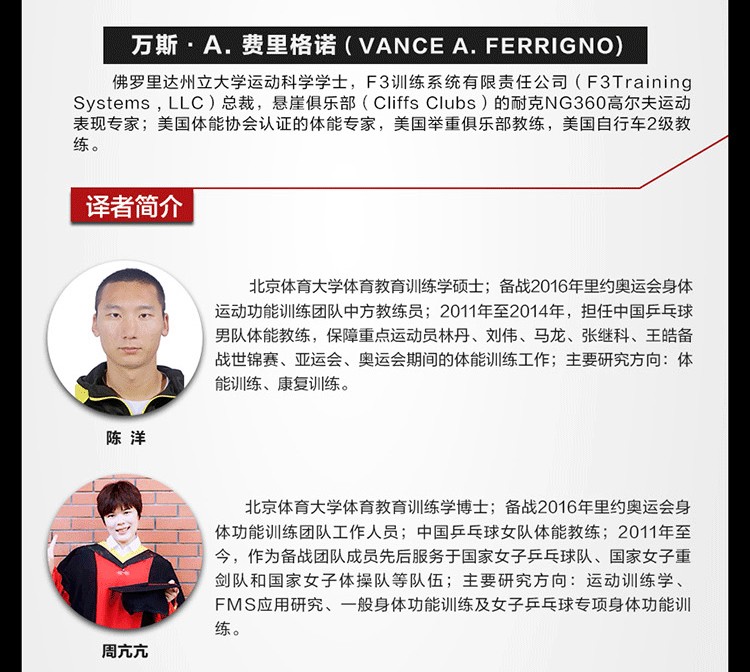李·E. 布朗 佛羅里達大西洋大學運動科學碩士,教育學博士,CSCS*D,FNSCA,FACSM, 美國體能協會(NSCA)理事會前任主席;2014 年獲得NSCA 的終身成就獎;美國加州州立大學富勒頓分校運動機能學院力量和體能專業教授。萬斯·A. 費里格諾 佛羅里達州立大學運動科學學士,F3 訓練系統有限責任公司(F3 T r a i n i n g S y s t e m s , LLC) 總裁, 懸崖俱樂部(Cliffs Clubs)的耐克NG360 高爾夫運動 表現專家(Nike NG 360 Golf Performance Specialist);美國運動醫學會認證的......