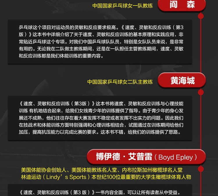 張繼科、國家乒乓球隊教練肖戰、閆森、黃海城鼎力推薦!美國體能協會NSCA創始人Boyd Epley誠意推薦! ·262個訓練內容,適用於14個運動大項:足球、羽毛球、網球、籃球、各項田徑運動、棒球、橄欖球... ·365幅運動員實拍動作照片和專業示意插圖,專業講解訓練動作基礎和專項方案 ·訓練原理與專項運動緊密結合,教練員和運動員都可以使用的訓練素材。 ·設計評估策略、制定訓練方案,教練員拿來就可以使用的實用參考資料。