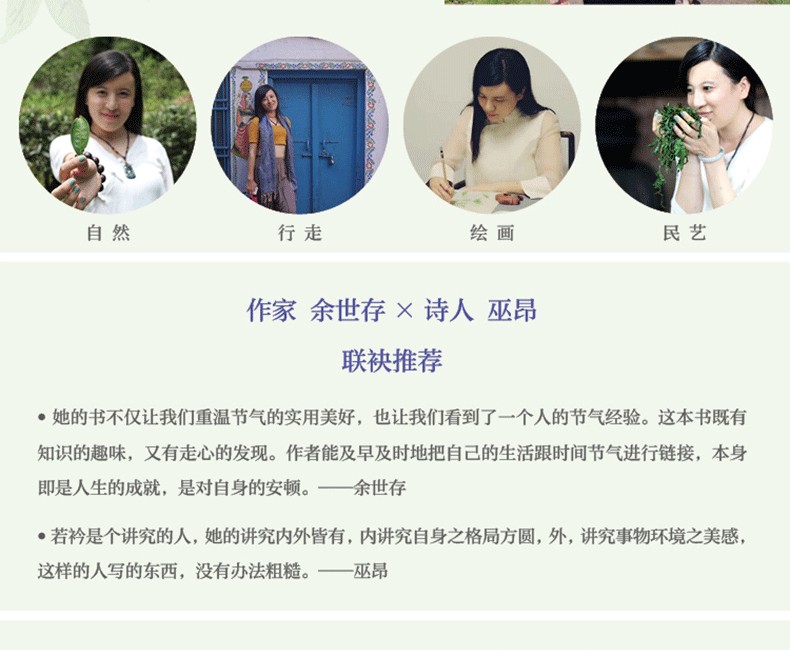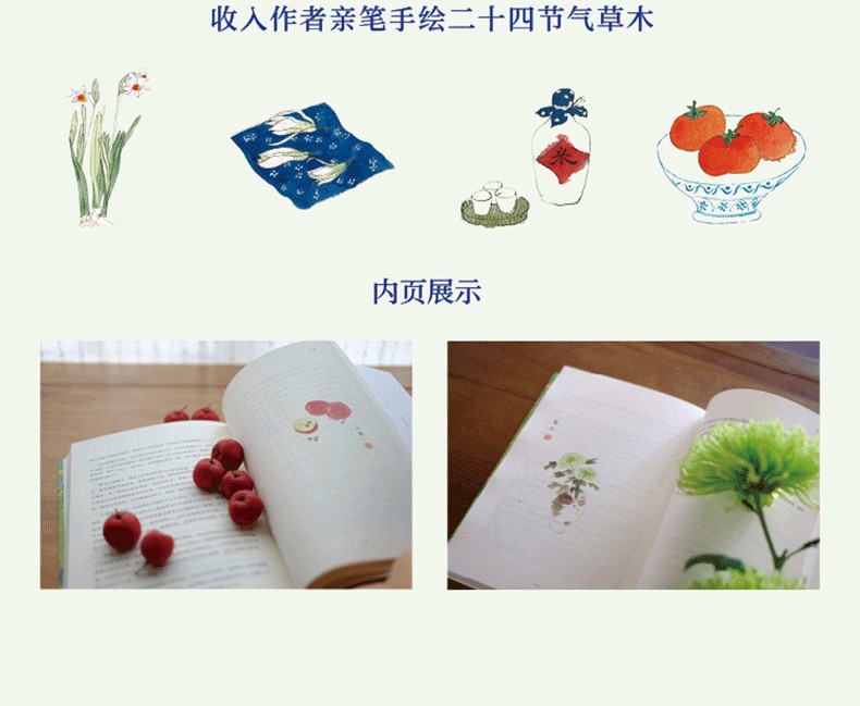 本書是一本以節氣為綱介紹草木風物及時令美食的生活美學之書。具體介紹了二十四節氣對應的草木,從植物引申到風物、美食、手藝,倡導遵從自然規律生活,遵從自然中衍生出的生活智慧。由自然風物出發挖掘相關的民俗典故,捕捉匠心民藝、時令雅趣,分享本真的生活方式,書寫節氣文化傳承的智慧與美好。
