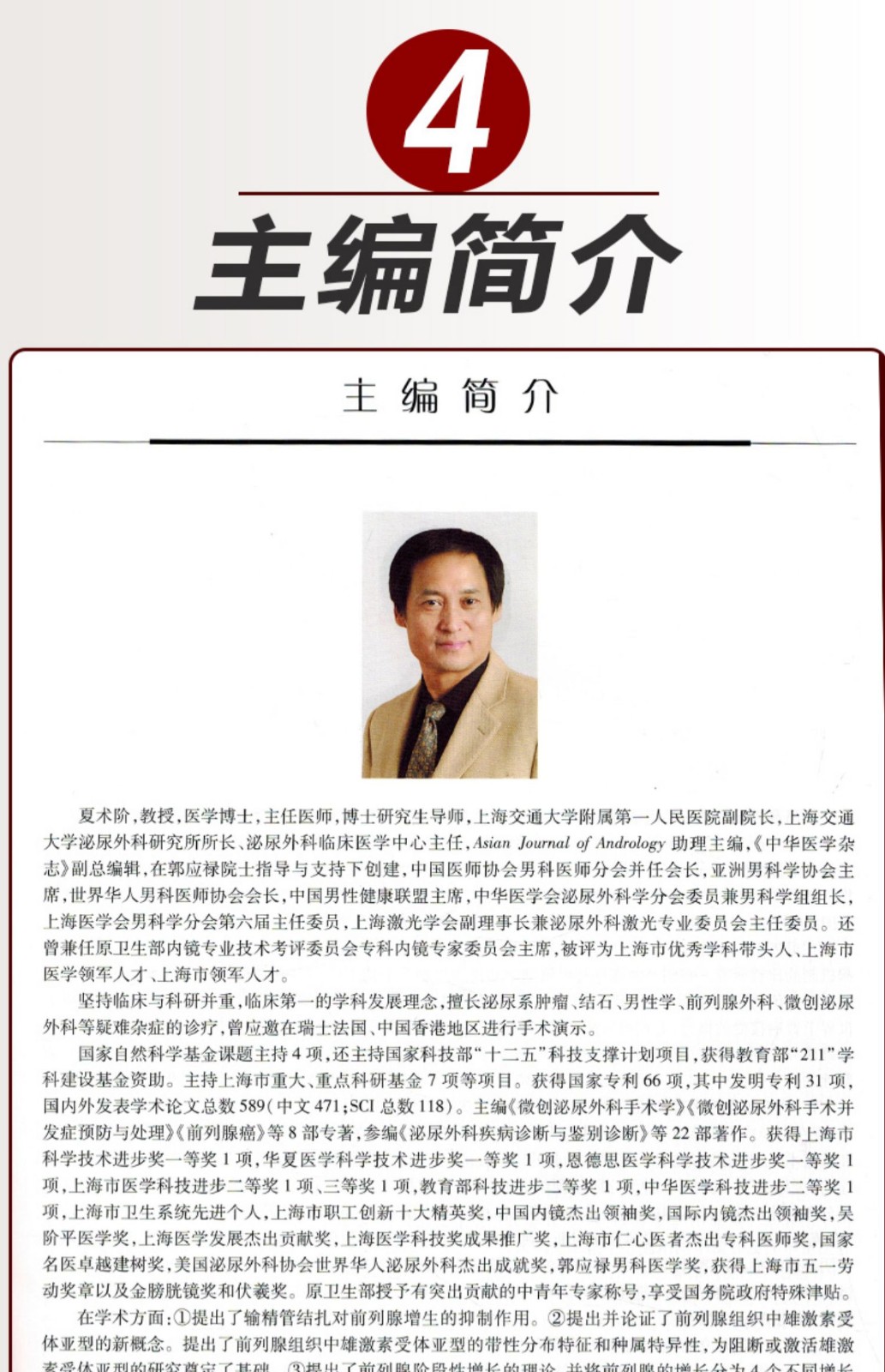 本書男科學的修訂版,由全國 的泌尿外科、男科專家、中國工程院院士、北京大學泌尿外科研究所名譽所長郭應祿教授擔任主編, 外100多位專家、學者編寫的大型學術專著。全書共有230餘萬字,全面介紹了男科學領域 學術成果、研究進展,以及 的臨床治療方法。其主要內容包括:男科學基礎、男科學臨床檢查與診斷技術、男子性功能障礙、男子性醫學、男子不育症、男子節育、性傳播疾病、男生殖系內分泌疾病、前列腺疾病、男科手術學,以及男科病的中醫中藥治療等。